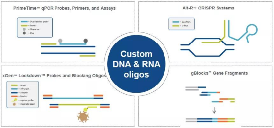 歷經(jīng)三十年的開疆拓土,各種資本與技術(shù)并購,IDT以Oligos(寡核苷酸)的合成作為核心技術(shù),為基因組學(xué)應(yīng)用開發(fā)了專有技術(shù),主要分為四大塊,下一代測序NGS、PCR引物探針、CRISPR 基因組編輯所用到的功能蛋白,模板DNA,向?qū)?span>RNA等、基因片段的合成。通過 GMP 服務(wù),IDT的產(chǎn)品被科學(xué)家用于研究多種癌癥以及大多數(shù)遺傳性和傳染性疾病。