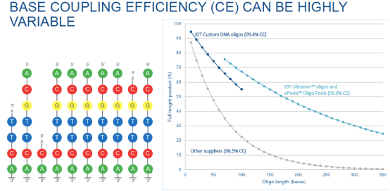 IDT的合成Oligo憑借其高質(zhì)量標(biāo)準(zhǔn)受到全世界科研者的青睞。IDT 采用合成柱法的方式單獨(dú)合成每條Oligo,在每個(gè)堿基耦合的過程中涉及到一個(gè)“偶聯(lián)效率”的概念,造就了超高的合成精度。同時(shí)IDT合成的高質(zhì)量不是說出來的,嚴(yán)謹(jǐn)?shù)馁|(zhì)控更是將產(chǎn)品質(zhì)量拿捏的死死的,每條Oligo通過ESI-MS(電噴霧質(zhì)譜)質(zhì)譜的方式,讓錯(cuò)誤的Oligo無所遁形,并且每一個(gè)通過質(zhì)檢的oligo都有一個(gè)質(zhì)控報(bào)告,也為后期IVD客戶做申報(bào)工作提供了極大的便利。