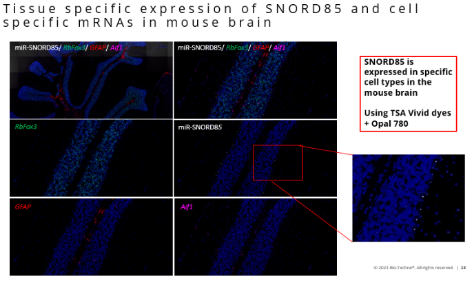 在小鼠腦組織切片的檢測中,也可獲得理想的結(jié)果。SNORD85可在小鼠腦某些細(xì)胞中特異性表達(dá),下圖中除了對SNORD85進(jìn)行檢測外,也對小鼠的神經(jīng)元(Rbfox3)、星形膠質(zhì)細(xì)胞(GFAP)、小膠質(zhì)細(xì)胞(Aif1)同時(shí)進(jìn)行檢測,可見不同靶標(biāo)特異的定位特征。