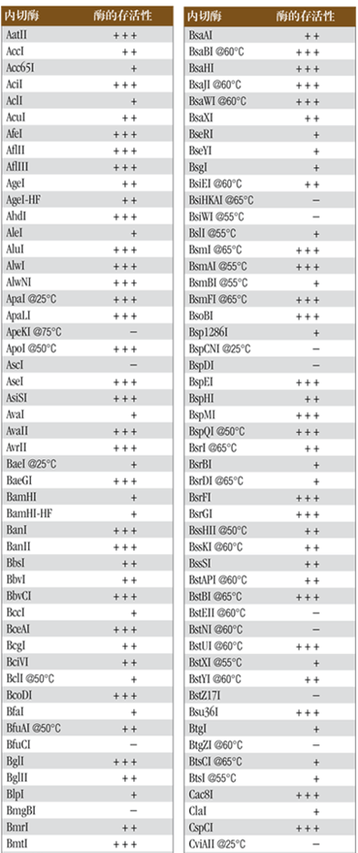 0.13 單位的酶量;表中標注有“++/+” 的酶是具有中等活性的延時內(nèi)切酶,16 小時完全酶切