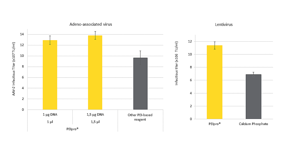 無論基于細(xì)胞培養(yǎng)的系統(tǒng)和生產(chǎn)規(guī)模如何,對(duì)于慢病毒和AAV, PEIpro?和PEIpro?-HQ的有效病毒載體產(chǎn)量分別優(yōu)于107IG/mL和109vg /mL。