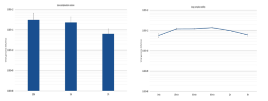左圖:復(fù)合物工作體積:由10%減至1%。右圖:復(fù)合物穩(wěn)定性: 可延長至6小時(shí)