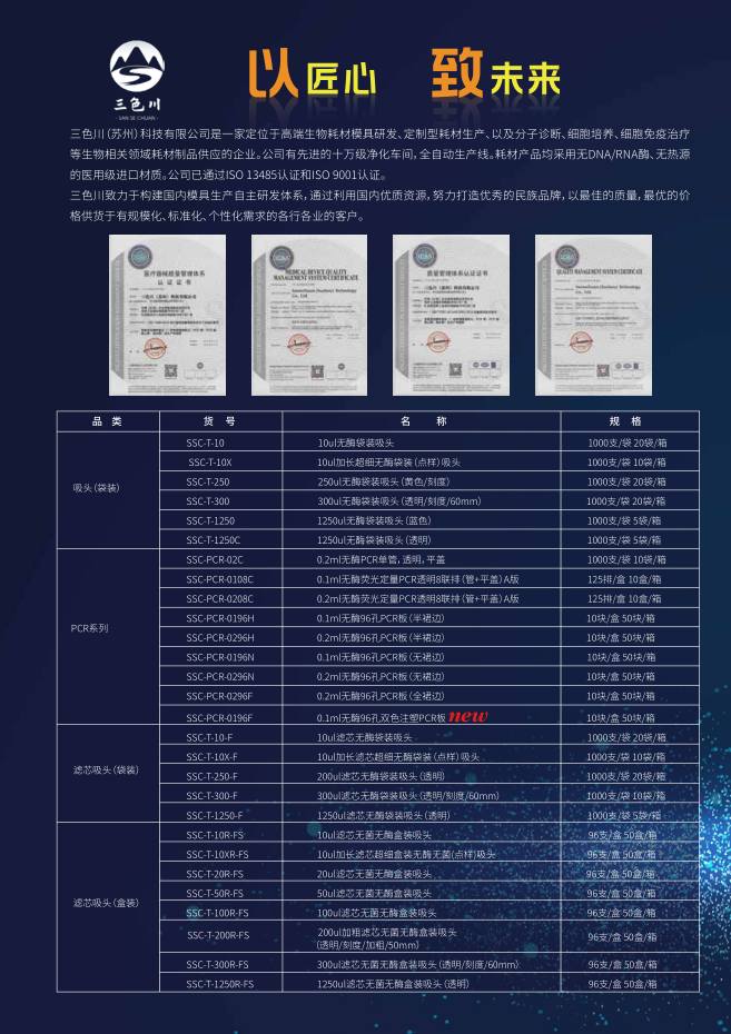 三色川(蘇州)科技有限公司是一家定位于高端生物耗材模具研發(fā)、定制型耗材生產(chǎn)、以及分子診斷、細(xì)胞培養(yǎng)、細(xì)胞免疫治療等生物相關(guān)領(lǐng)域耗材制品供應(yīng)的企業(yè)。公司有先進(jìn)的十萬級(jí)凈化車間,全自動(dòng)生產(chǎn)線。耗材產(chǎn)品均采用無DNA/RNA酶、無熱源的醫(yī)用級(jí)進(jìn)口材質(zhì)。公司已通過ISO 13485認(rèn)證和ISO 9001認(rèn)證。